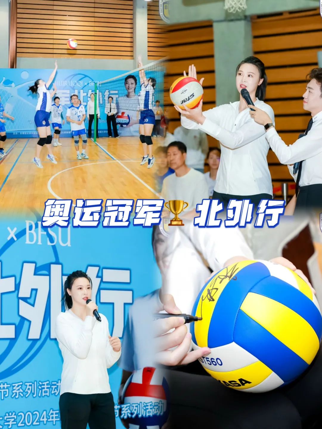 在教学互动环节,惠若琪从垫球和发球两项基础技术入手,讲解要领、亲身示范,指导现场观众学习排球技巧,为在场师生带来一节生动的“冠军教学课”。校排球队也为现场观众带来了精彩的对攻表演赛,惠若琪作为教练对双方表现进行点评,并对北外的排球氛围和排球队训练水平给予了高度肯定。